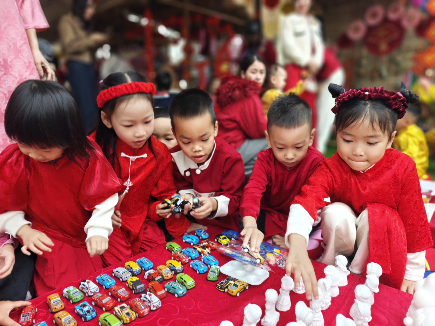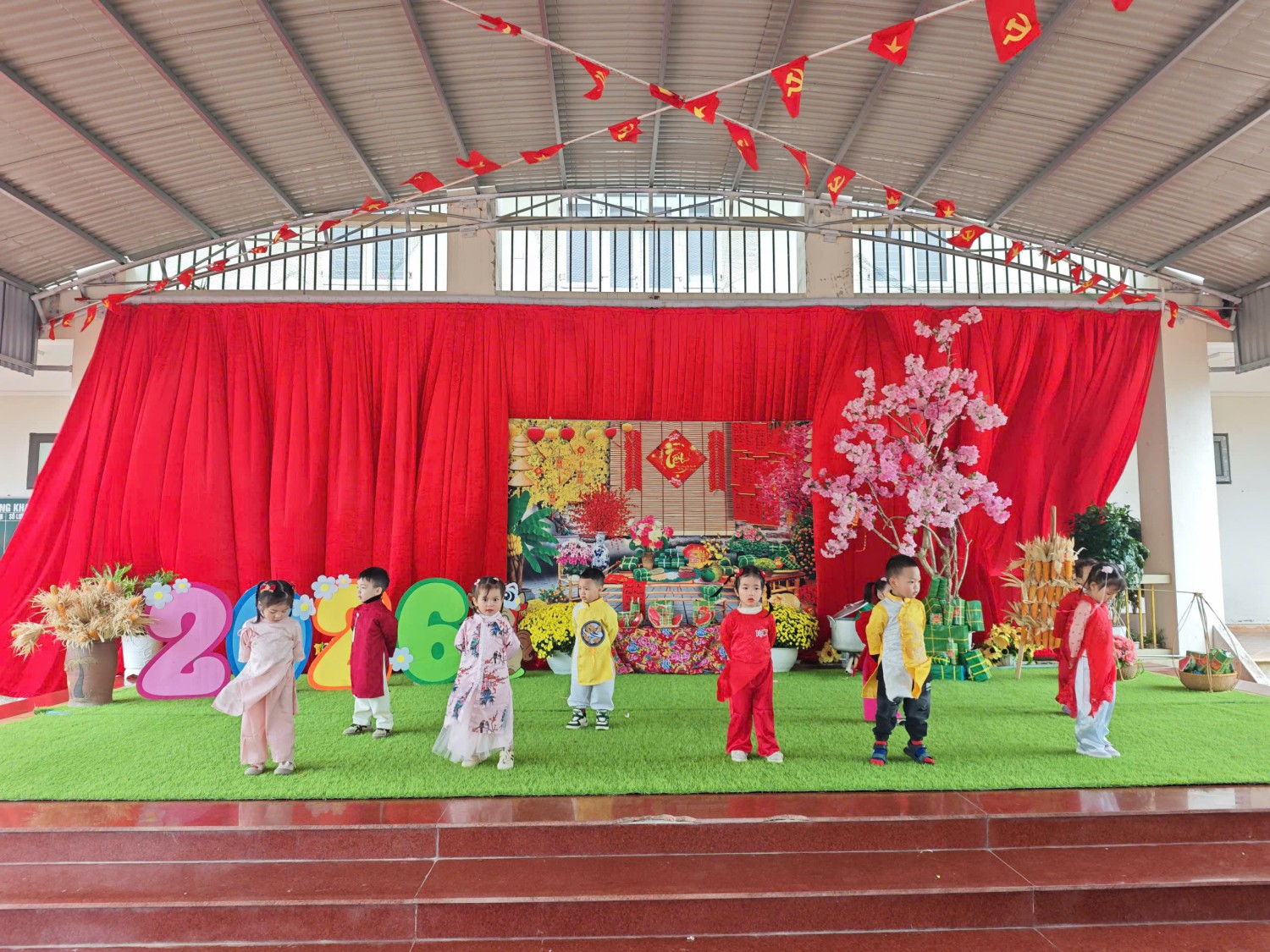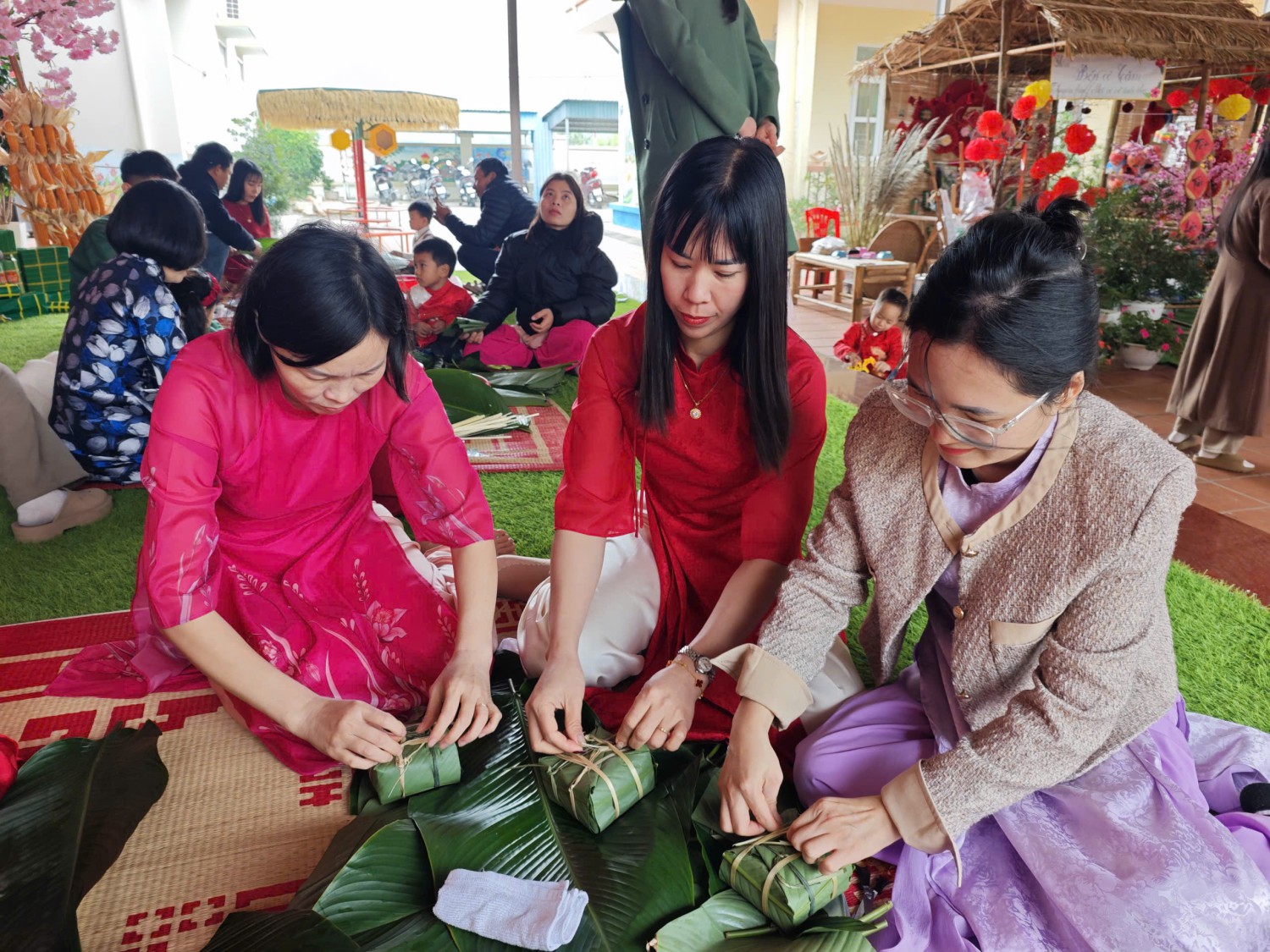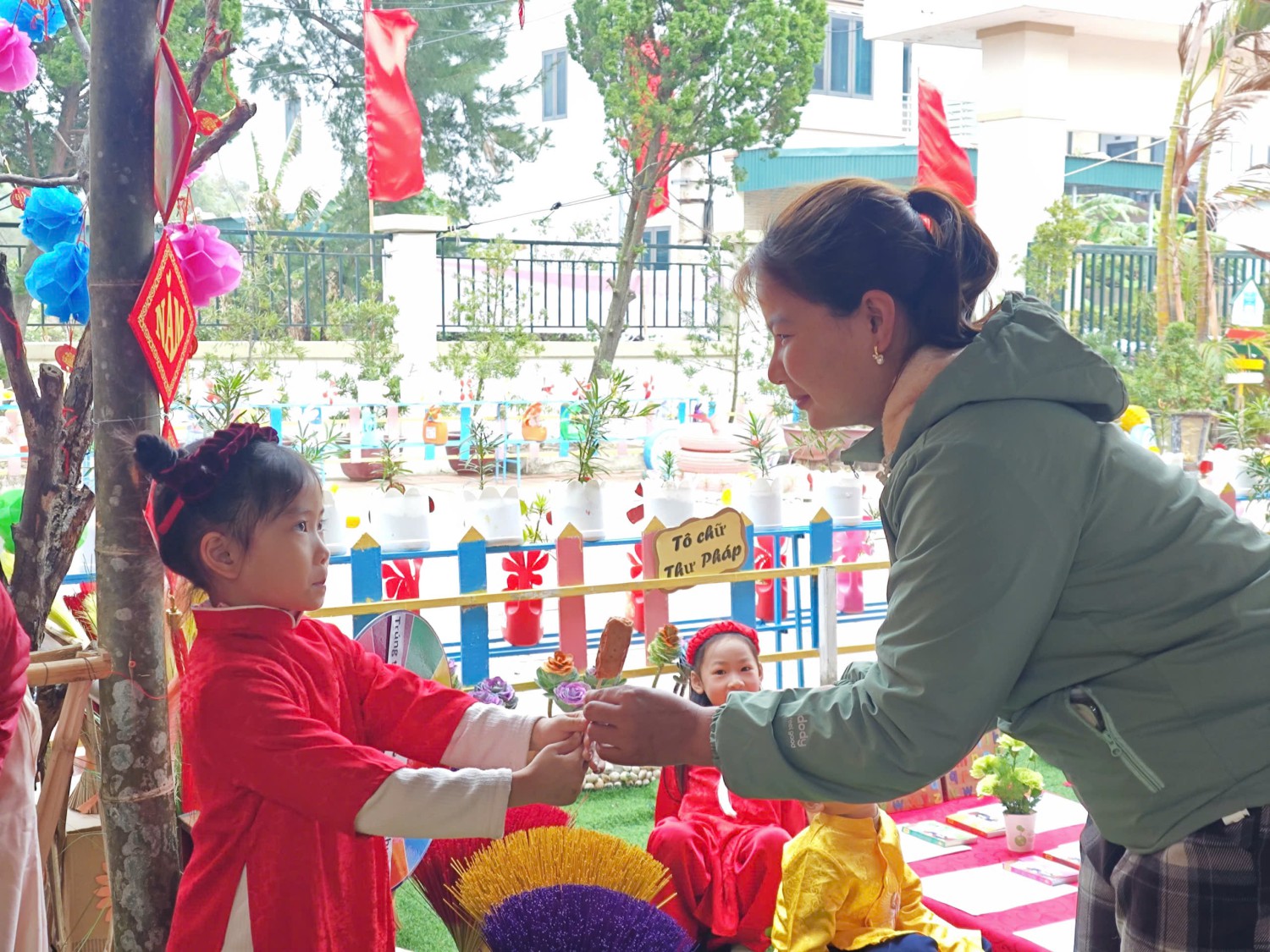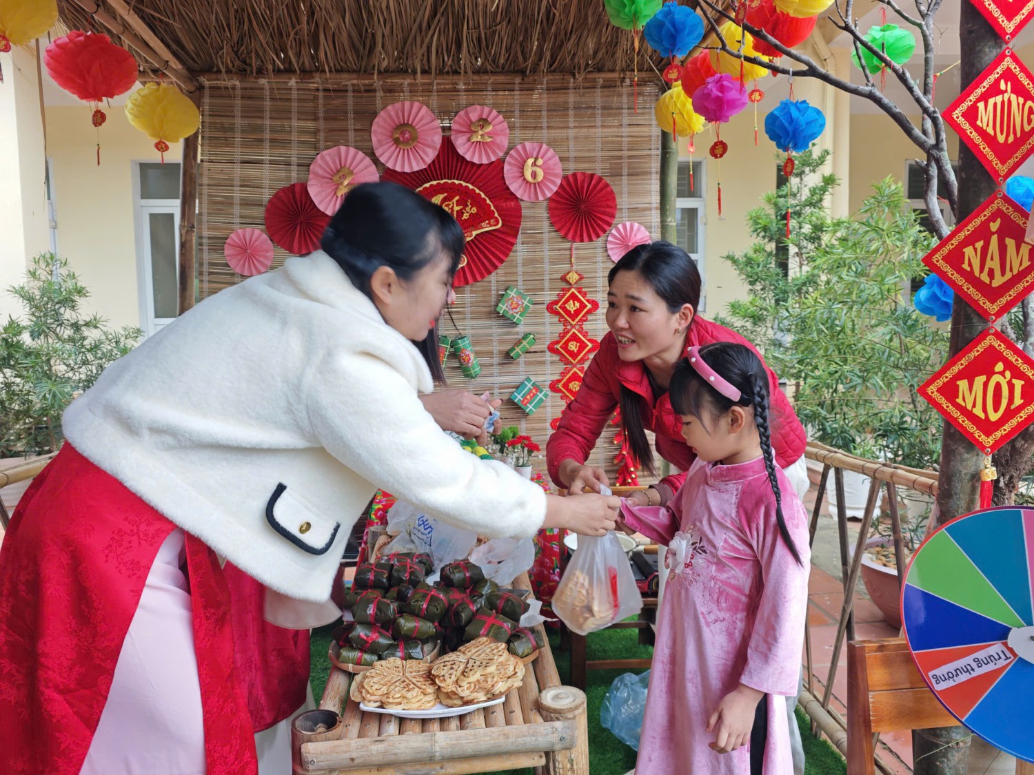 Lễ hội được tổ chức trong không gian rực rỡ sắc xuân với cờ hoa, câu đối đỏ, tiểu cảnh ngày Tết và các gian hàng trưng bày sản phẩm do cô và trò cùng thực hiện. Đây không chỉ là dịp để các bé vui chơi, trải nghiệm mà còn giúp trẻ hiểu thêm về ý nghĩa của Tết cổ truyền Việt Nam.