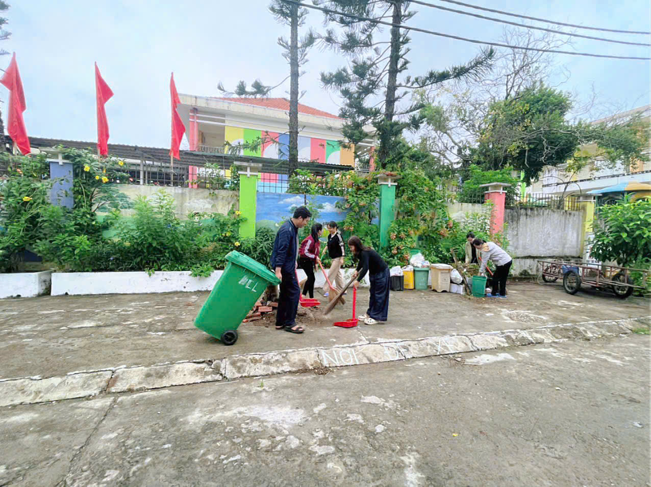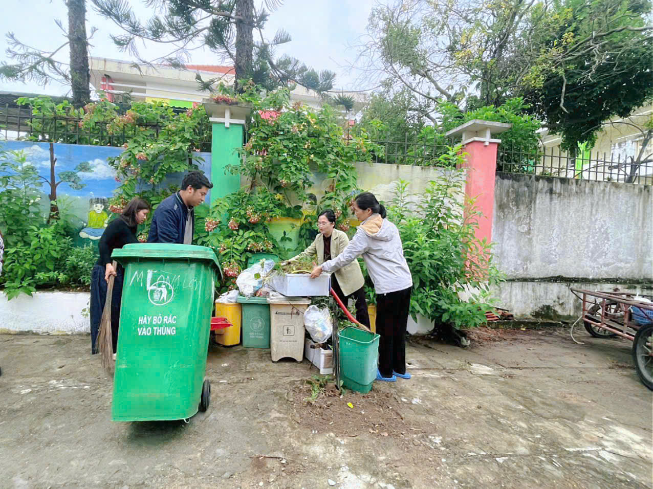 Toàn thể cán bộ, giáo viên, nhân viên nhiệt tình tham gia các hoạt động: quét dọn, thu gom rác thải, phát quang cỏ dại, chăm sóc bồn hoa, cây cảnh... tạo nên không gian xanh – sạch – đẹp trong và ngoài khuôn viên trường học.